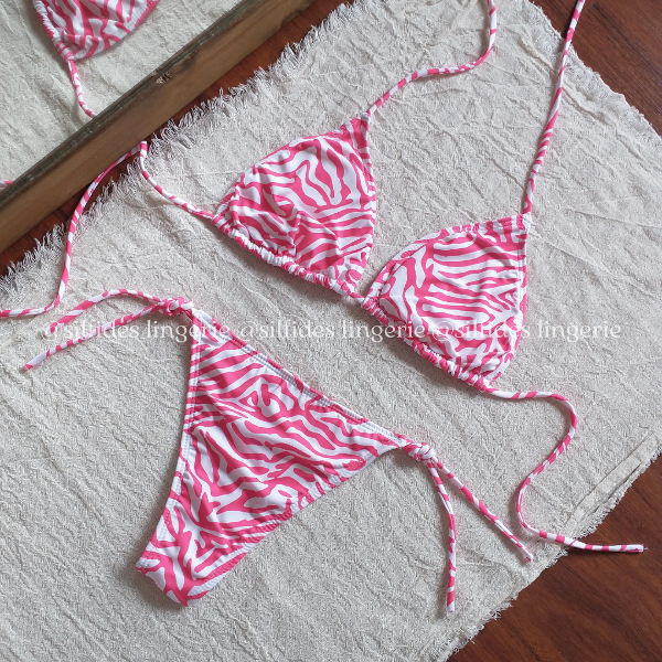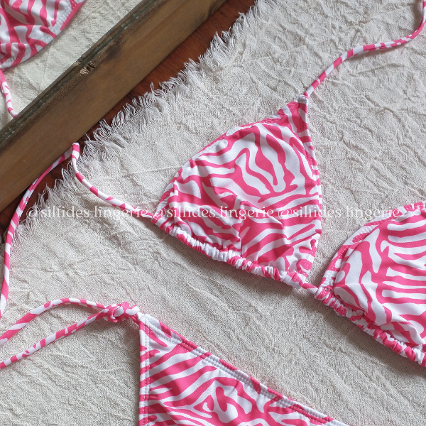 Bikini triangulito clásica, totalmente forrada. Less y corpi para atar. Lycra fina estampada, incluye tacitas desmontables.