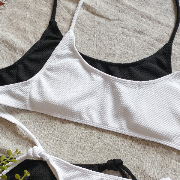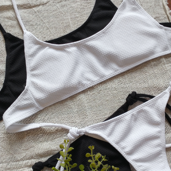Bikini top texturada, con tiras en espalda y cuello. Bombi less para atar.