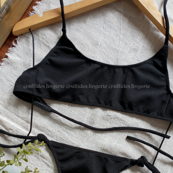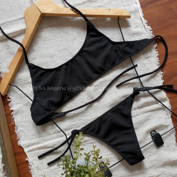 Bikini top texturada, con tiras en espalda y cuello. Bombi less para atar.