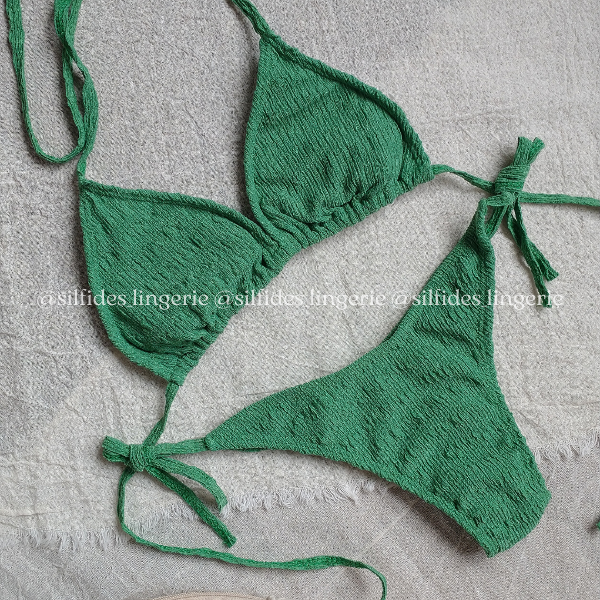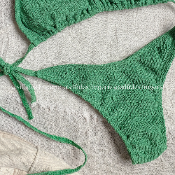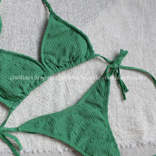 Bikini triangulito clásica, texturada. Incluye tacitas desmontables. Tela rígida, no es lycra.