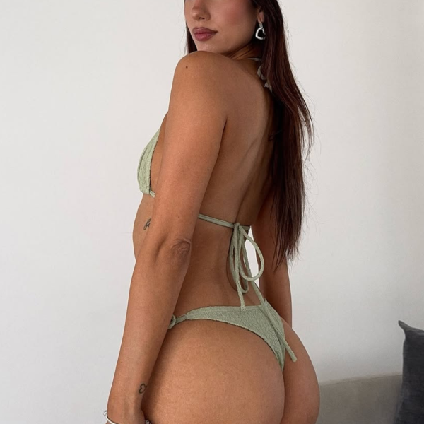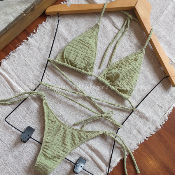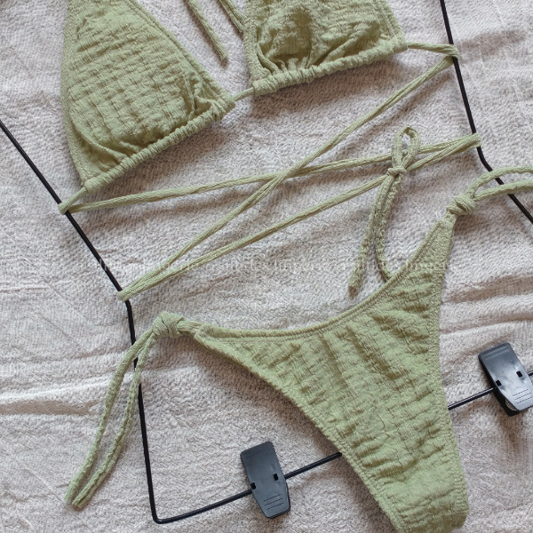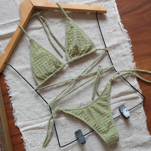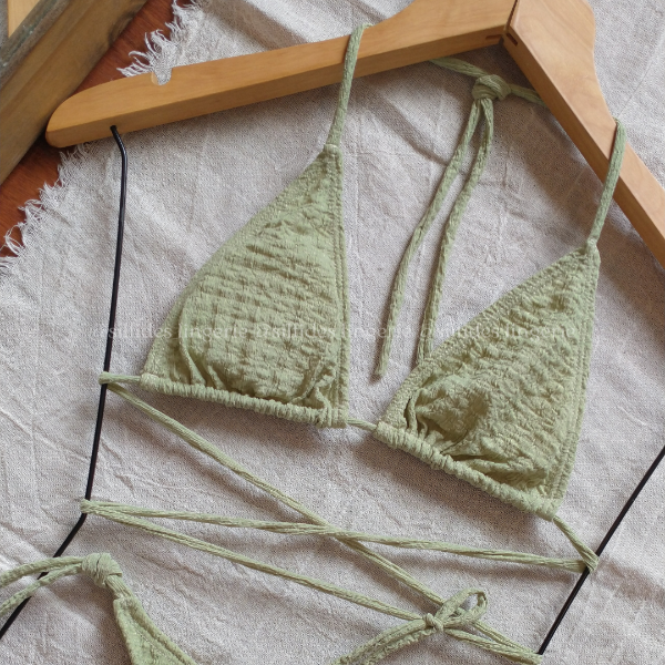 Bikini triangulito clásica, tiras largas. Confeccionada en bambula. Incluye tacitas desmontables.