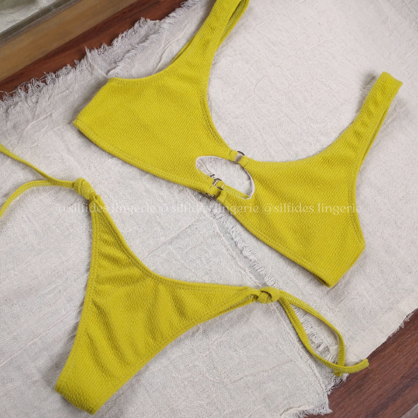 Bikini texturada, algodón con lycra. Corpi con ganchito en la espalda, bombis less en V, tiro bajo (va a la cintura, no es cubritiva como otros modelos, TENER EN CUENTA ANTES DE COMPRAR, LAS BIKINIS NO TIENEN CAMBIO UNA VEZ ENVIADAS/RETIRADAS).
