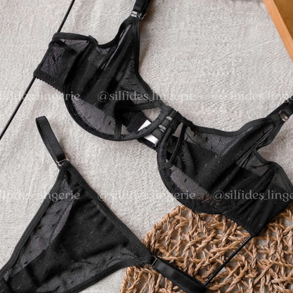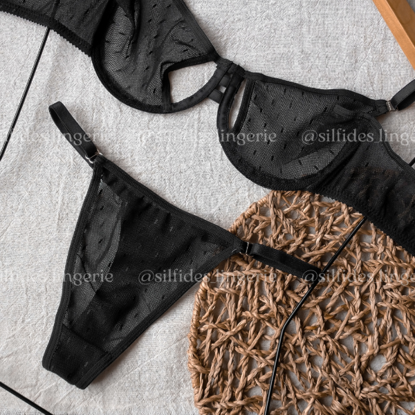 Conjunto confeccionado en microtul plumetí. Corpiño con aro y con aberturas. Less regulable.