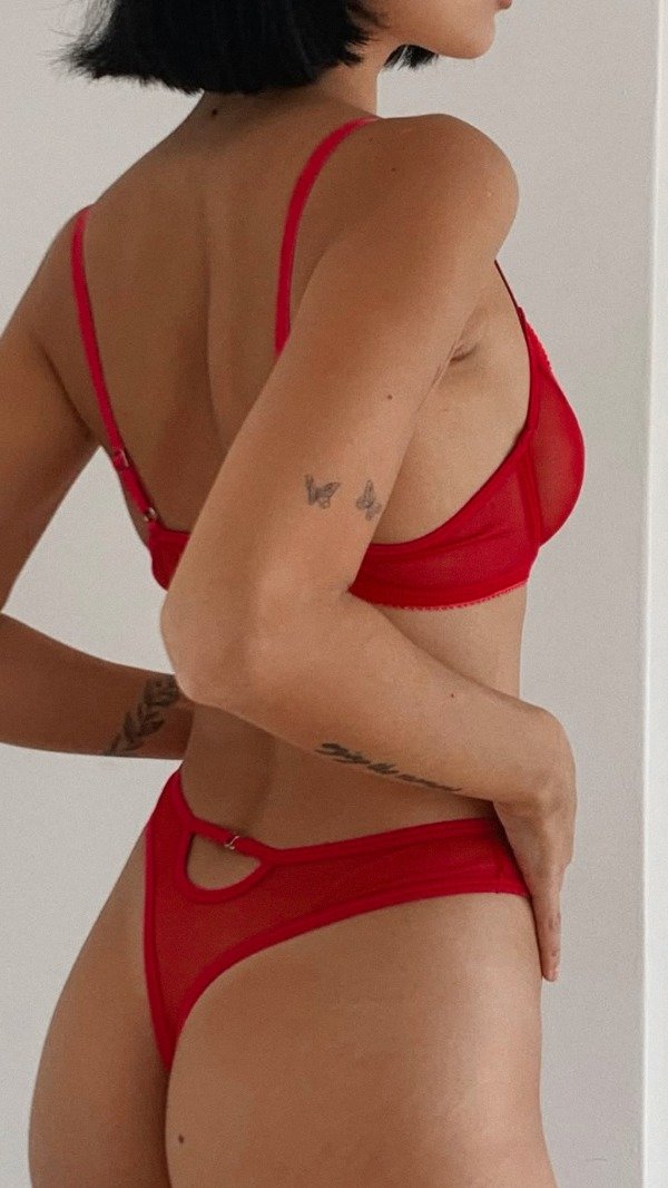 Conjunto confeccionado en microtul. Corpiño con aro. Bombi colaless con detalle de abertura en la parte posterior.