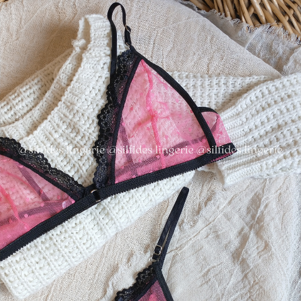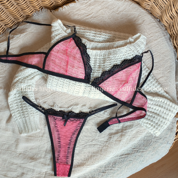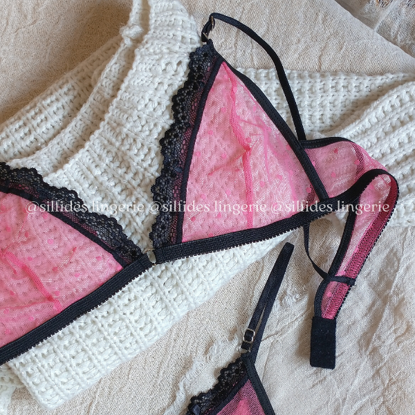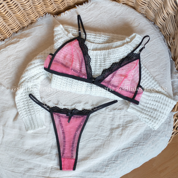 Conjunto confeccionado en microtul plumetí de lunares, detalles en puntilla. Breteles regulables en corpiño y less.