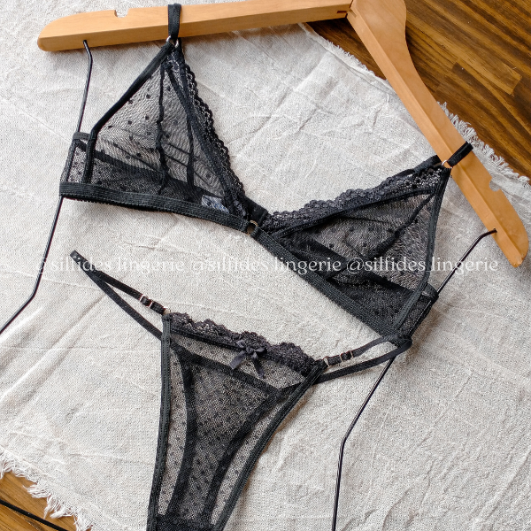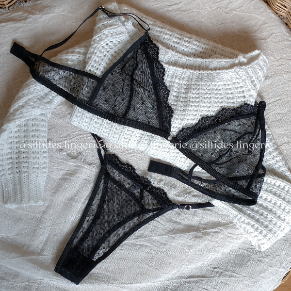 Conjunto confeccionado en microtul plumetí de lunares, detalles en puntilla. Breteles regulables en corpiño y less.