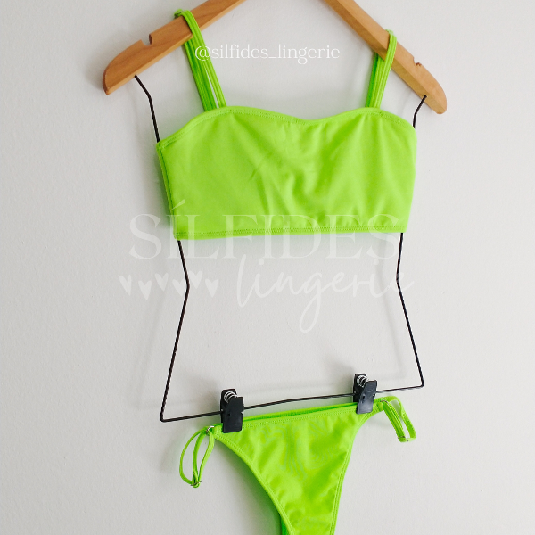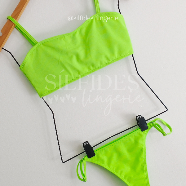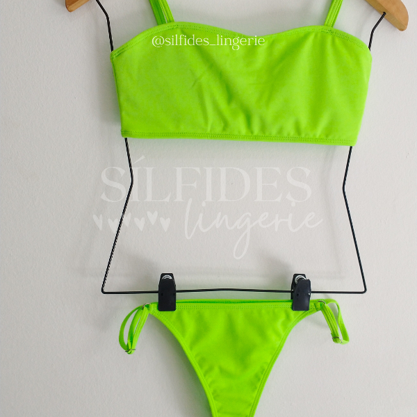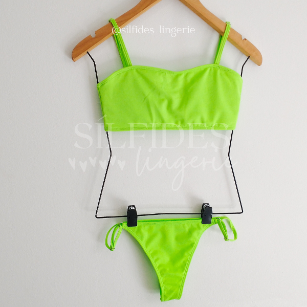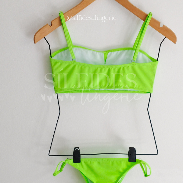 Bikini con top entero (no se regula en la espalda), breteles regulables y tazas desmontables.