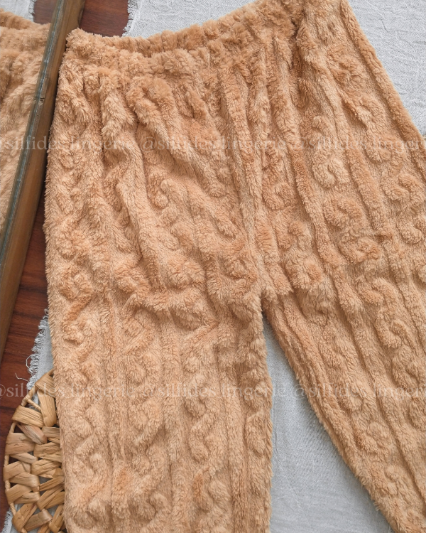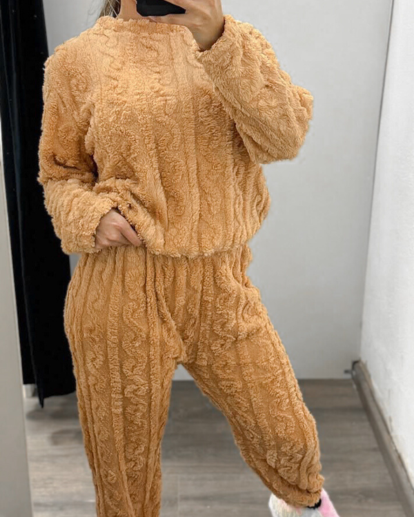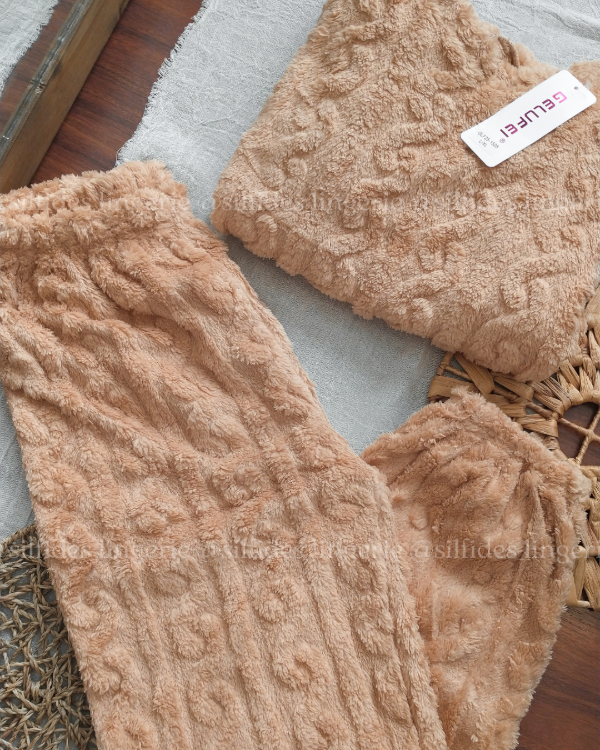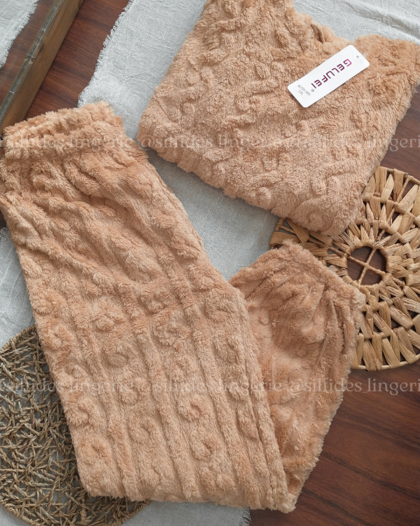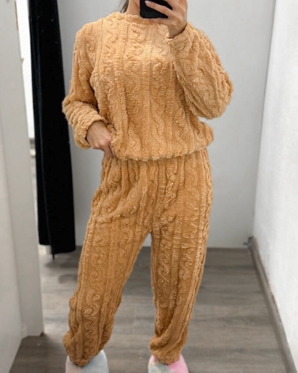 Pijama importado 2 piezas: buzito y pantalón, ambos con puños en mangas y piernas.