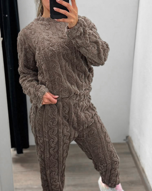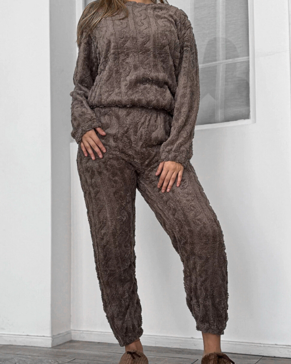 Pijama importado 2 piezas: buzito y pantalón, ambos con puños en mangas y piernas.